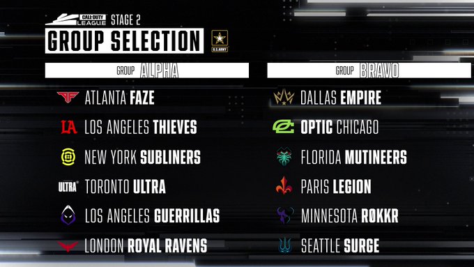 El grupo Alpha está formado por Atlanta Faze, Los Angeles Thieves, New York Subliners, Toronto Ultra, Los Angeles Guerrillas y London Royal Ravens.